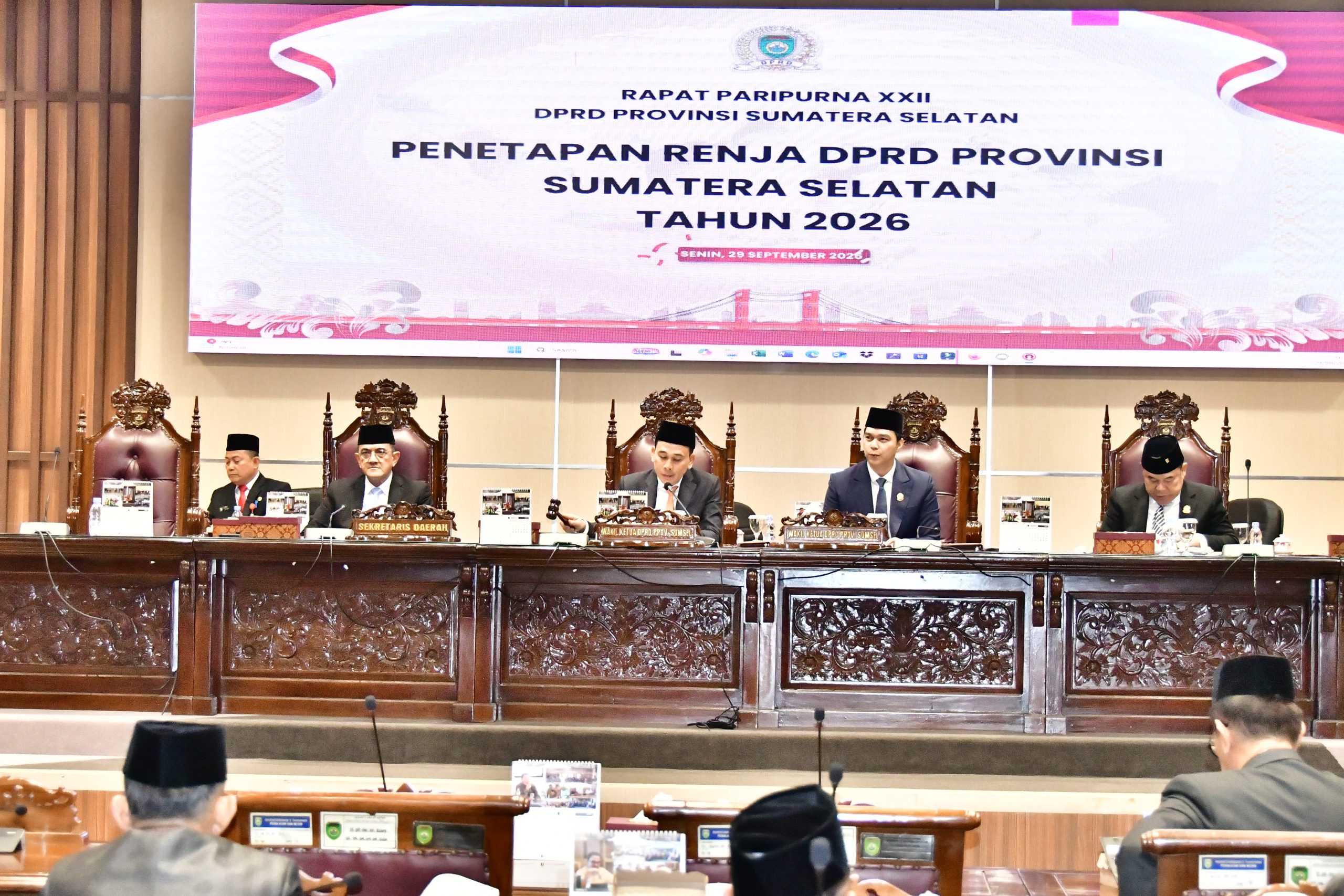 DPRD Provinsi Sumatera Selatan resmi menetapkan Rencana Kerja Tahun 2026 dalam Rapat Paripurna XXII (22) dengan agenda Penetapan Rencana Kerja DPRD Provinsi Sumatera Selatan Tahun 2026, yang digelar pada Senin (29/9).